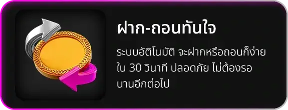 ตอบ : ระบบฝาก-ถอนอัตโนมัติรวดเร็วภายใน 30 วินาที รองรับทุกธนาคารชั้นนำ และ True Money Wallet ไม่มีขั้นต่ำในการฝาก-ถอน